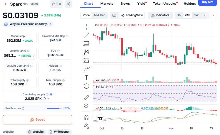 Spark (SPK) 价格上涨尽管周线和月线趋势仍然下跌,但Spark在过去24小时内上涨了2.22%。Spark向机构流动性产品和质押系统的转型正在帮助缓解抛售压力。技术指标也显示抛售正在放缓,但流动性仍然较低,导致价格波动加剧。