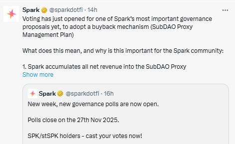 该组织将其所有净收入存入SubDAO金库。通过引入基于规则的回购系统,该项目希望为SPK提供稳定的支持,尤其是在……期间。加密货币市场低迷时期许多用户表示,这项计划为数字资产奠定了更坚实的财务基础,并确保资金决策遵循明确的指导方针。因此,Spark治理投票被视为使Spark的运营与社区利益保持一致的一步。