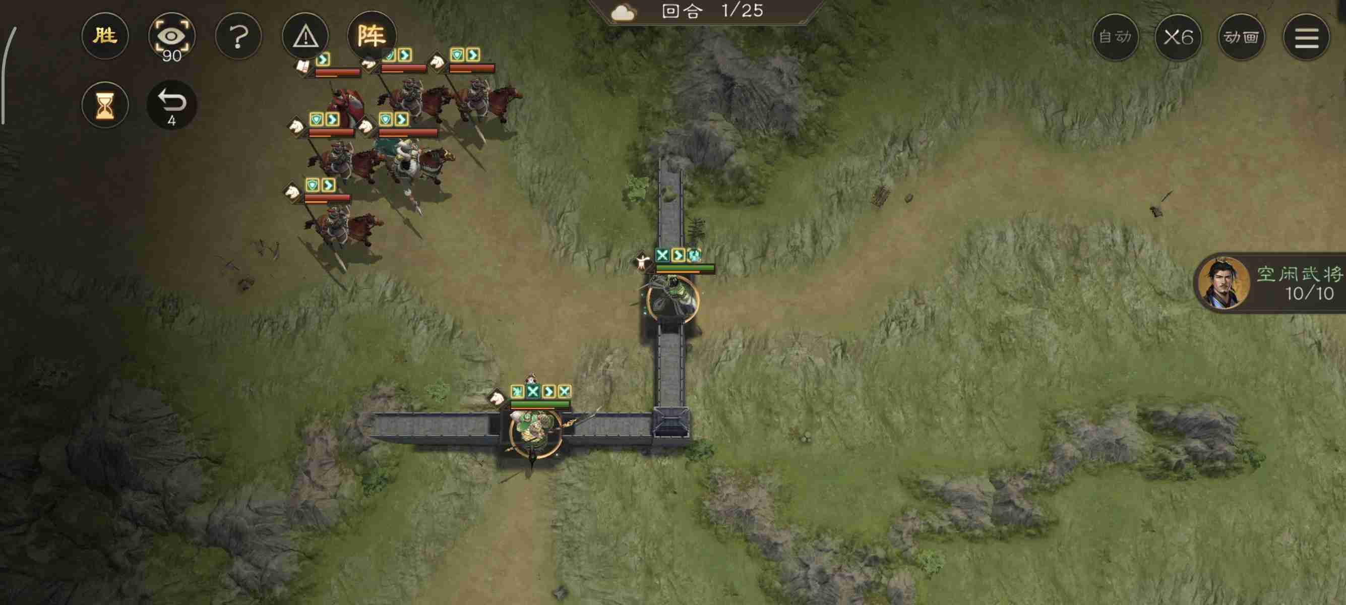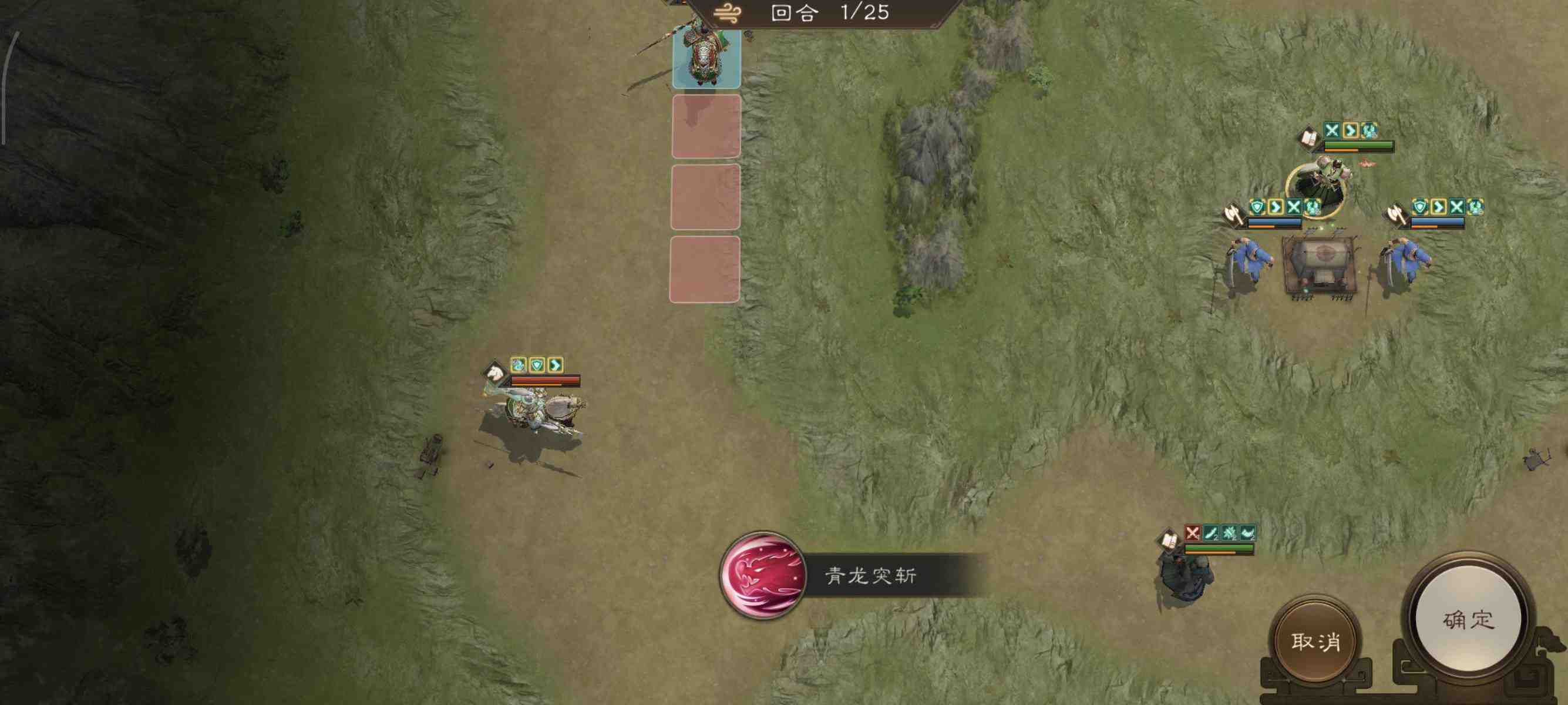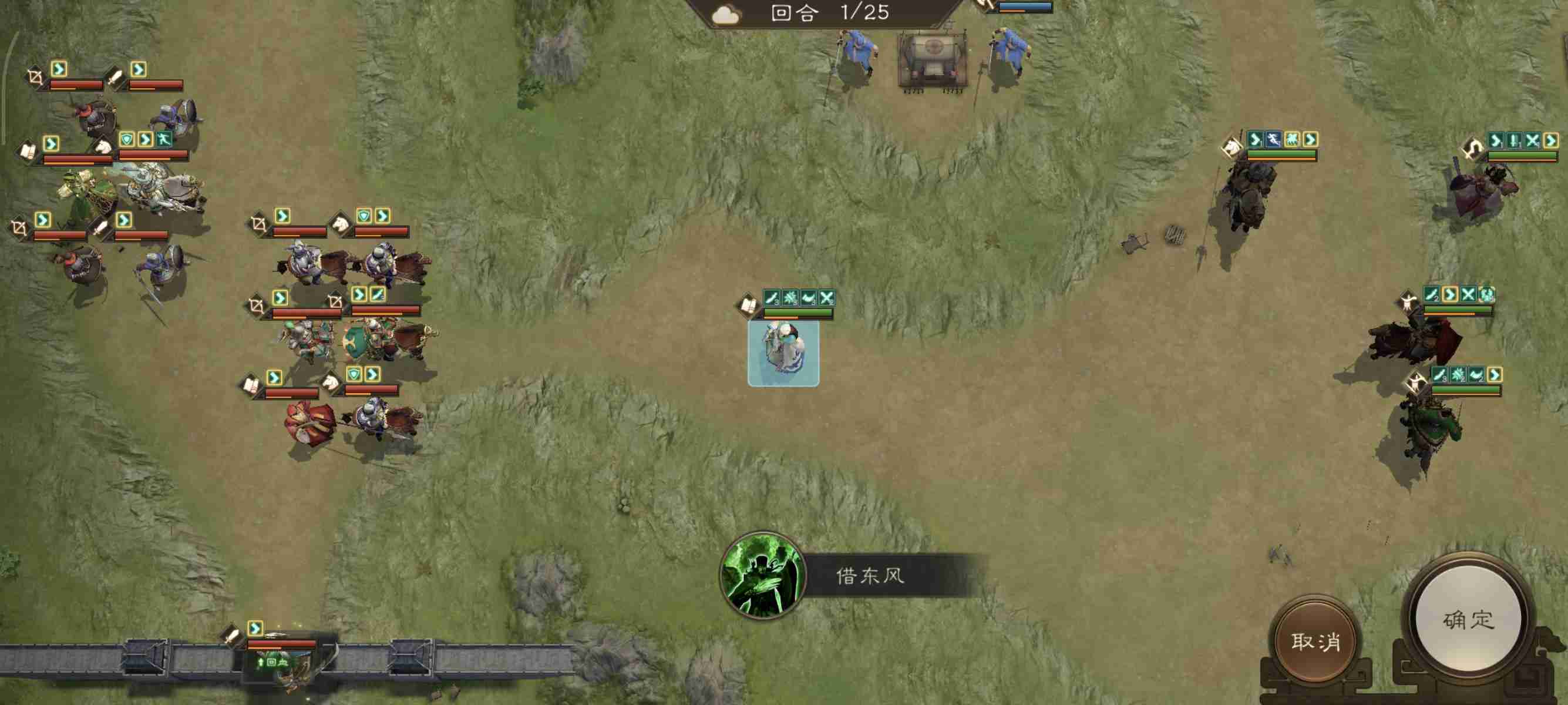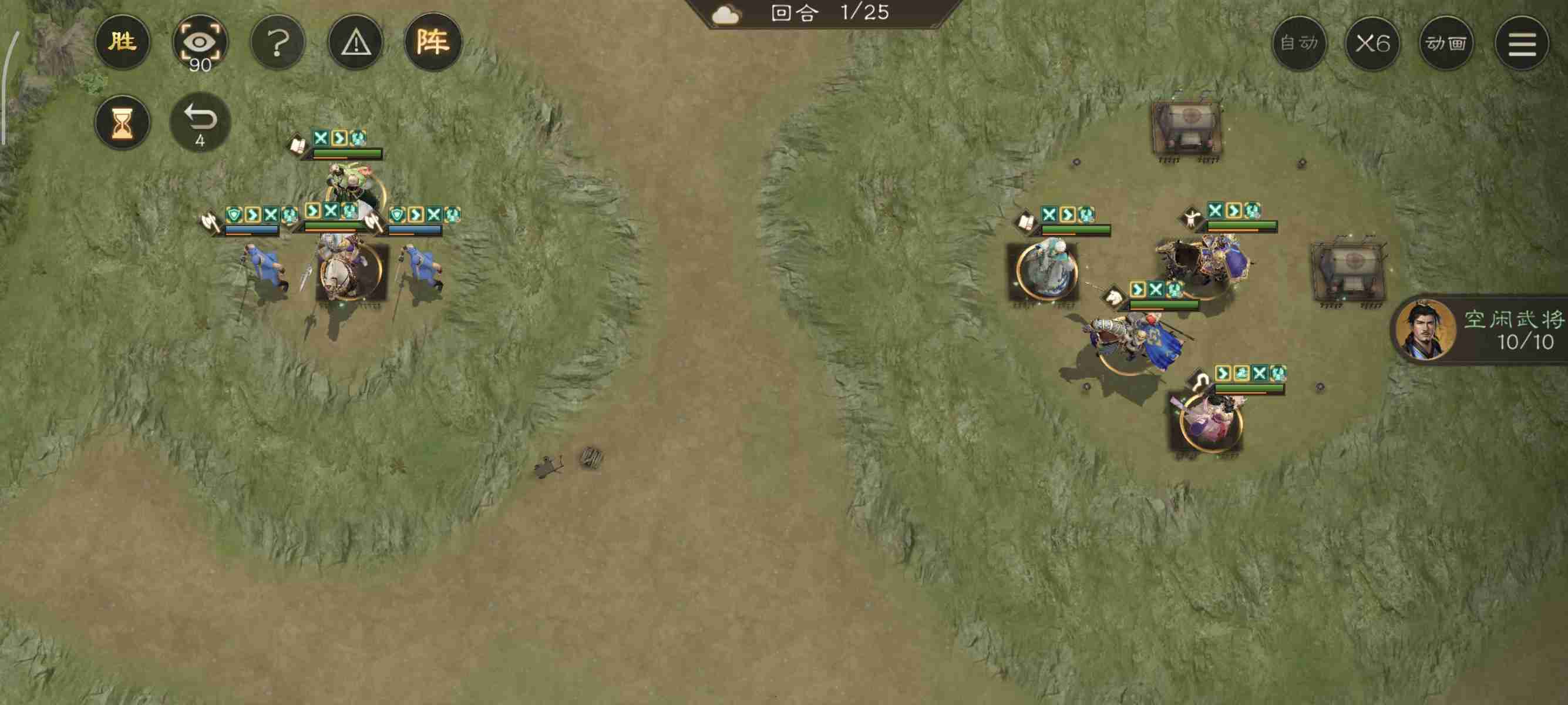 开局我军被分割为多个战场,所以想一回合通关比较难!本关的难点是如何尽量把诸葛的buff刷满。