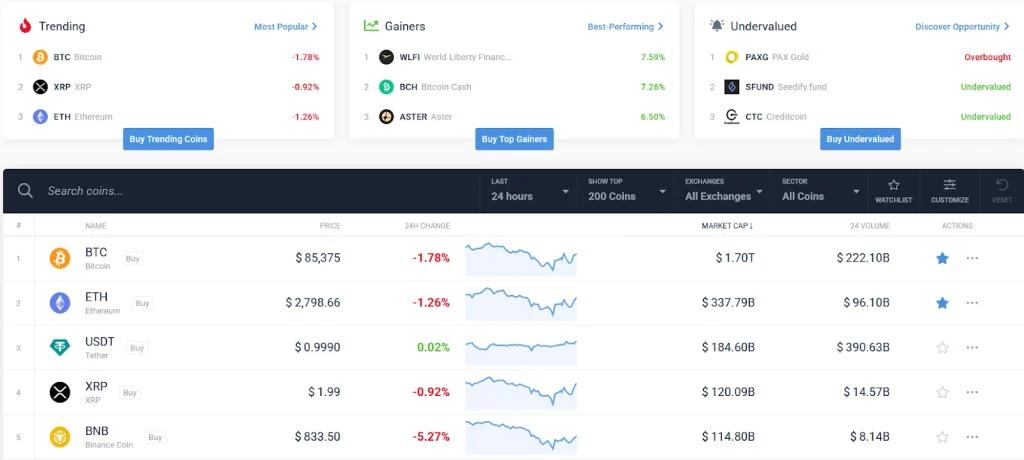 CoinCodex是一个功能全面的投资追踪平台,最适合对股票市场也感兴趣的加密货币投资者。该平台凭借其丰富的上市资产选择、实用的投资组合追踪和汇率转换器等工具以及详尽的加密货币市场数据而令人印象深刻。