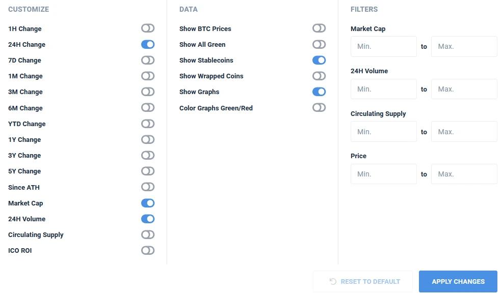 您可以使用“自定义”菜单来定制首页上显示的加密货币列表。在这里,您可以选择网站应显示的指标,甚至可以设置条件来过滤掉市值和交易量等指标未达到特定阈值的加密货币。