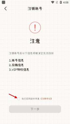 4、在注销账号前会有《注销协议》弹出,用户需要仔细阅读,避免注销后造成不必要的损失,在确认注销后点击勾选阅读协议,然后选择即可。