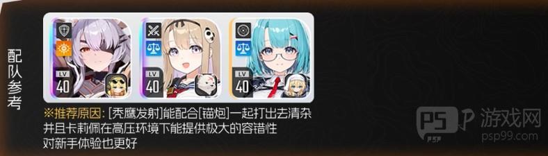 第三个组队阵容是专门为轰炸流玩家提供的,米卡+百丽儿+卡利佩,三个全攻可触发“秃鹫发射”,搭配2张伤害最高的“天鹰长剑”,再配合“重新集结”,可直接对银幕次数进行增加,每一轮“银色之幕”最少可触发一次攻击,玩家选择蓝色装备搭配就有机会拿到非常不错色分数,尤其是在清小怪的时候整体表现不错。