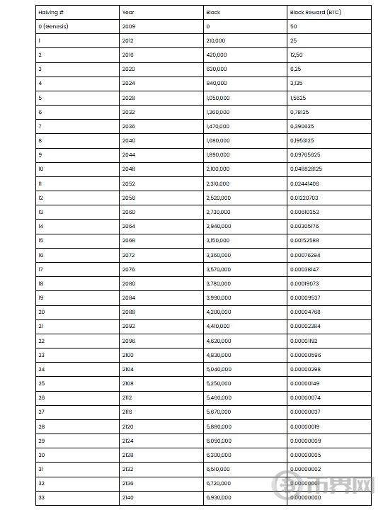 由于每次减半降低奖励但挖矿仍维持约每 10 分钟一个区块的速度,比特币供给将以涓流速度缓慢释放,直至触及 2100 万枚上限,因此时间线将延续至 2140 年。