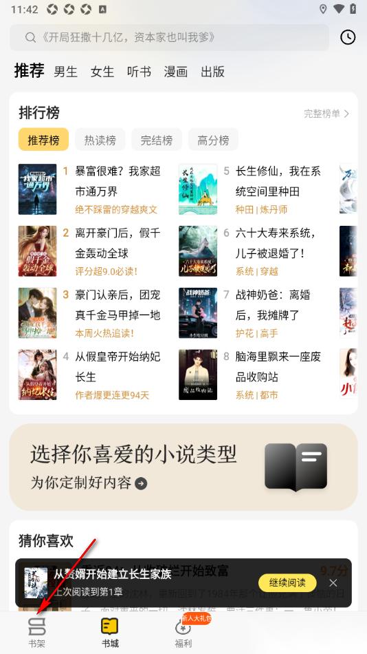 1.在手机上找到追读小说app这款软件,将底部菜单栏中的【书架】选项点击打开。
