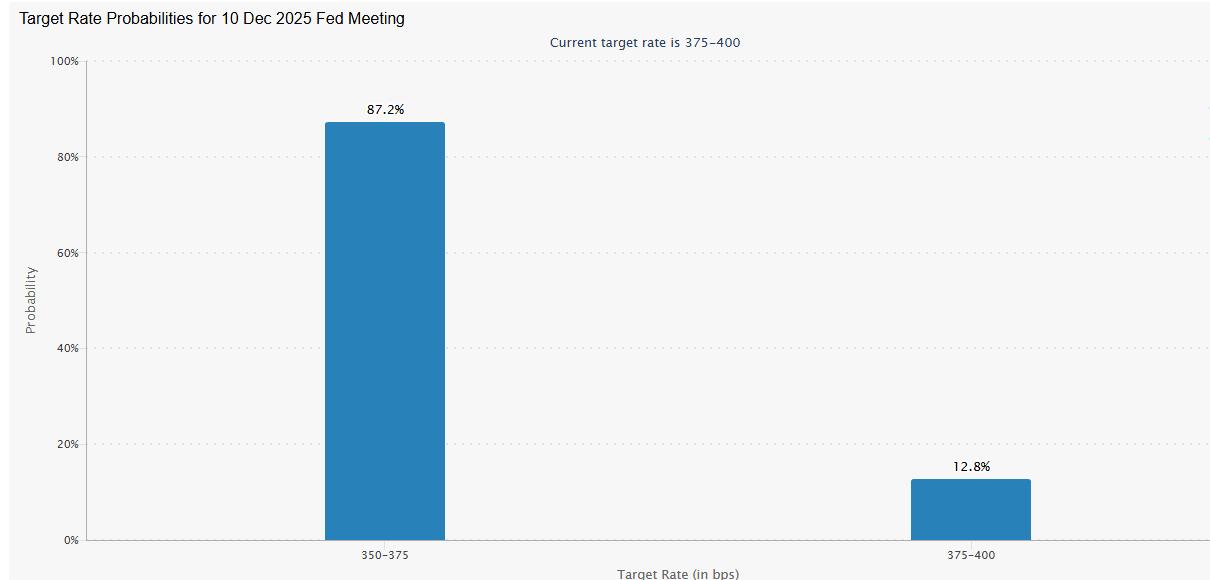 最后,根据芝加哥商品交易所(CME)的FedWatch工具显示,降息25个基点的概率已飙升至87.2%。此外,仅有12.8%的交易员预期美联储将维持利率不变。