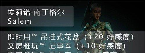 接下来那自然就是很重点的送礼攻略,每一个成员的喜好一定要明确。亚瑟南丁格尔喜欢各类的厨具,例如烤面包机,微波炉,还有小烤箱。这些都可以获得20个好感度。埃莉诺则比较喜欢一些文艺的东西,例如挂式花盆就可以获得20个好感度,文房雅玩记事本可以获得10个好感度。来来西亚主要是咖啡爱好者,送咖啡机可以获得20个好感度,送医疗包可以获得10个好感度。阿米尔会沉迷于电子娱乐,可以通过赠送无线耳机,还有曲棍球台获得20个好感度。如果送游戏显示器,可以获得10个好感度。