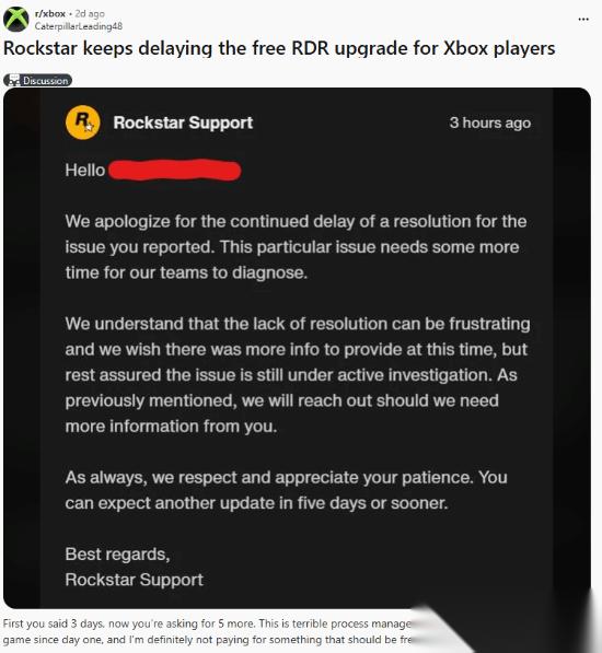 R星表示,需要额外时间来解决一个导致Xbox 360版《荒野大镖客:救赎》数字版玩家无法获取Xbox Series X/S升级补丁的问题。R星客服向一位玩家发送了消息,承认了延期并确认问题正在积极调查中。