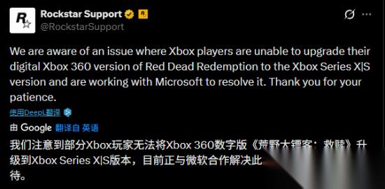 此前,R星曾发布声明确认《荒野大镖客:救赎》在Xbox平台上的升级存在问题。R星早些时候表示:“我们已知晓导致Xbox玩家无法将其Xbox 360数字版《荒野大镖客:救赎》升级至Xbox Series X|S版本的问题,目前正与微软合作解决。感谢您的耐心。”