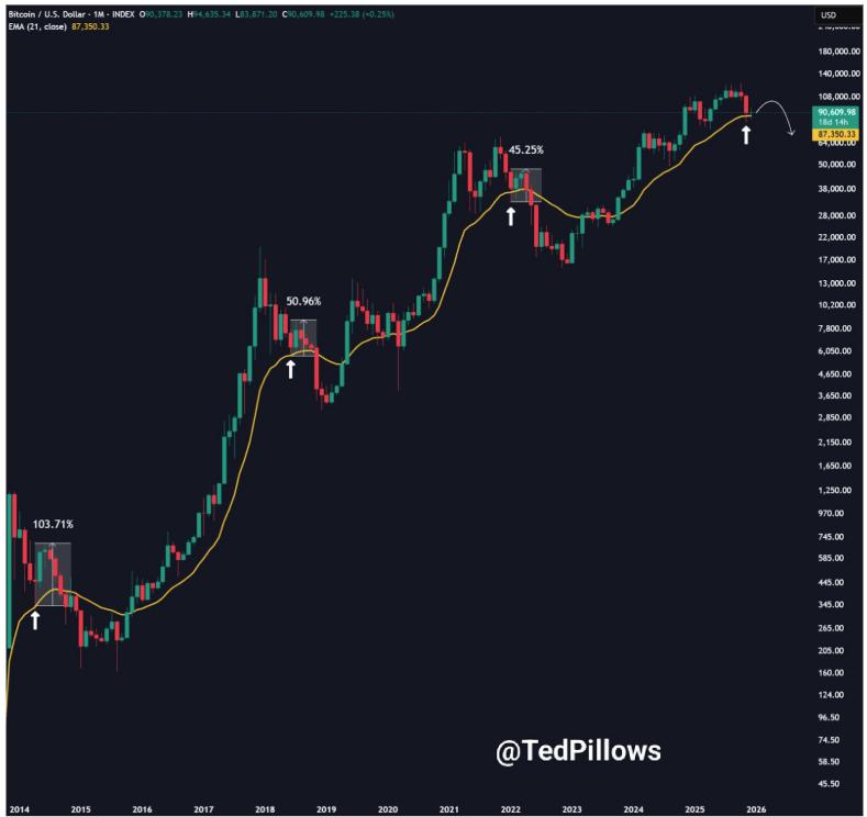 尽管人们对日本央行加息的担忧日益加剧,但比特币的前景并非完全悲观。例如,分析师泰德·皮洛斯指出,比特币……目前正在与……互动其月线 EMA-21 水平在之前的周期中一直扮演着启动平台的角色。