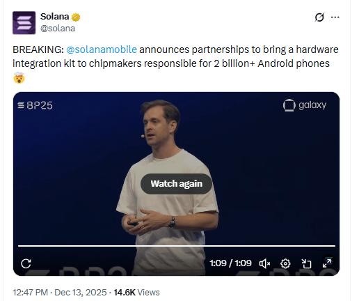 2025年12月13日,Solana Mobile宣布与多家芯片制造商建立合作关系,将为超过20亿部安卓手机提供硬件集成套件。s总结在我们之前的报道中该公司表示,将与FXTech、联发科及其TEE合作伙伴Trustonic合作,将Solana Mobile技术栈打包,以便更广泛地分发到Android平台。与此同时,Solana Mobile表示,正在构建原型机,并与主要硬件制造商洽谈,以期实现更广泛的推广。