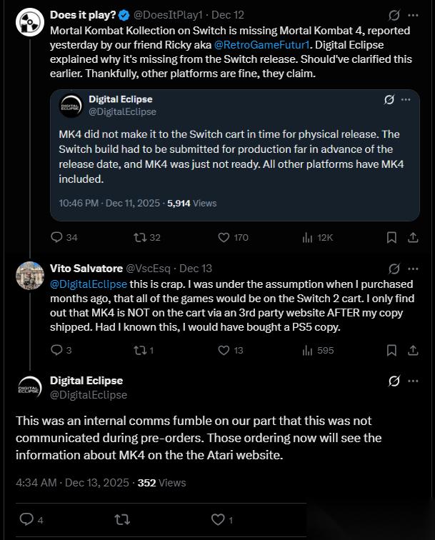 Digital Eclipse同时确认此情况仅影响任天堂版本。PlayStation 5实体版的光盘内包含了合集中的所有游戏。官方表示若未来Switch平台进行卡带重印,新版将包含《真人快打4》。