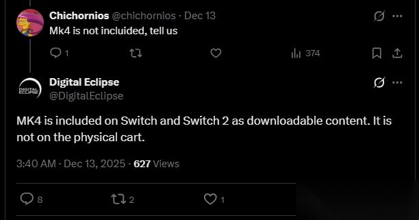 自实体版上市以来,《真人快打》粉丝们发现游戏卡带中并未包含《真人快打4》。Digital Eclipse在社交媒体多次回复中确认了此事——解释称Switch版本的构建必须"提前很久"提交,而《真人快打4》"尚未准备就绪",因此将其作为"可下载内容"提供。