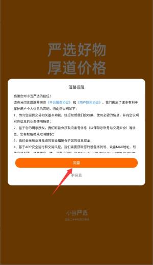 小当严选app怎么登录,首次启动应用时,系统会显示用户协议和隐私政策,阅读后点击同意按钮进入主界面,进入程序首页后,在底部导航栏中选择"我的"页面,进入个人账户管理区域。
