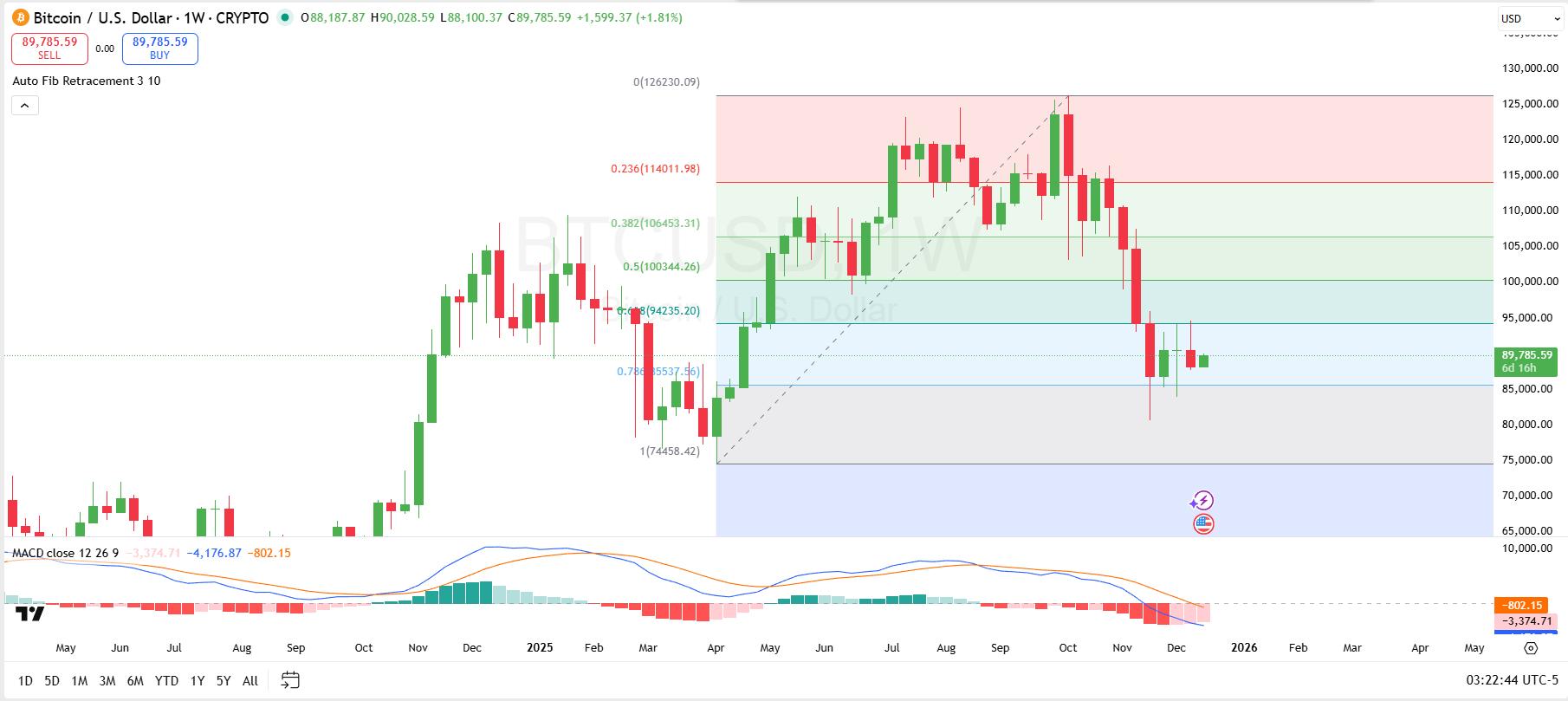 通过技术分析深入研究比特币的价格走势,周线图显示斐波那契水平线是支撑位和阻力位的关键参考。这些水平线从 10 月份接近 126,030 美元的高点到 74,458 美元左右的低点,突显了关键区域。