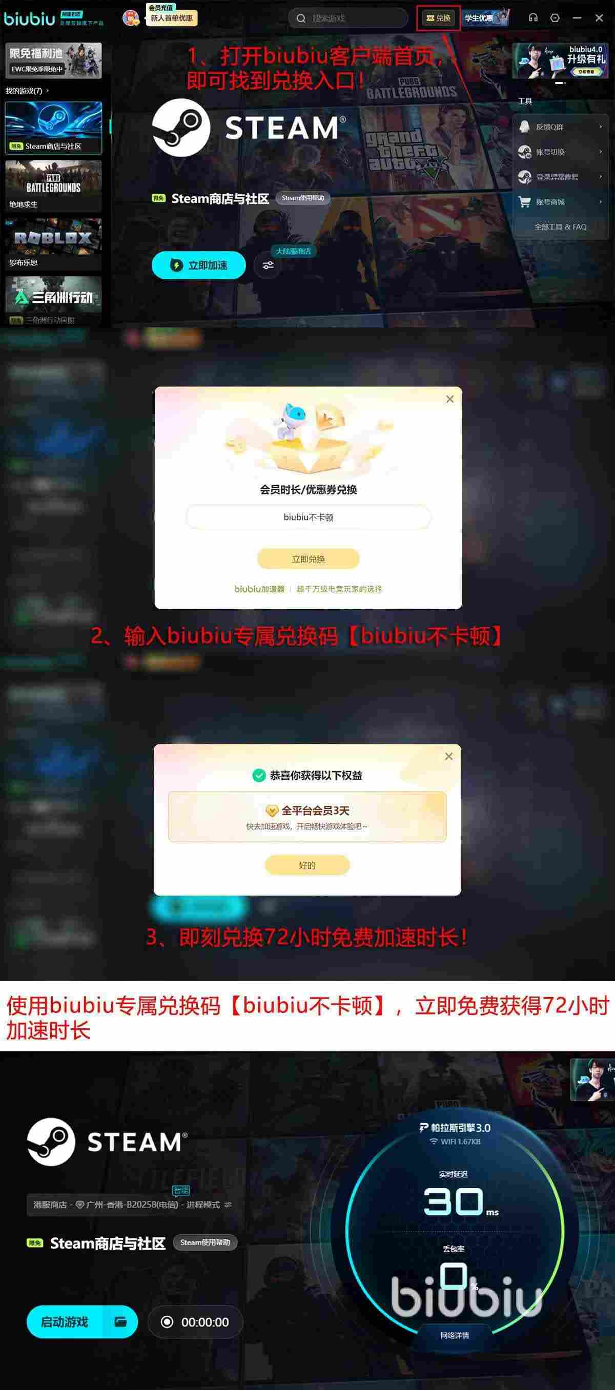 如果想要下载,只需通过biubiu加速steam商店,既可以轻松提高浏览各游戏专区的速度,以及提升下载速度 ,对游戏直接加速即可,想要体验现在还有免费时间能够领取,最长能有4天,注册新账号,直接能有24小时免费时长,成为会员后参与会员才能参加的【biubiu不卡顿】兑换码兑换活动,还能在首页上在领到72小时,这样就能一共得到96小时。