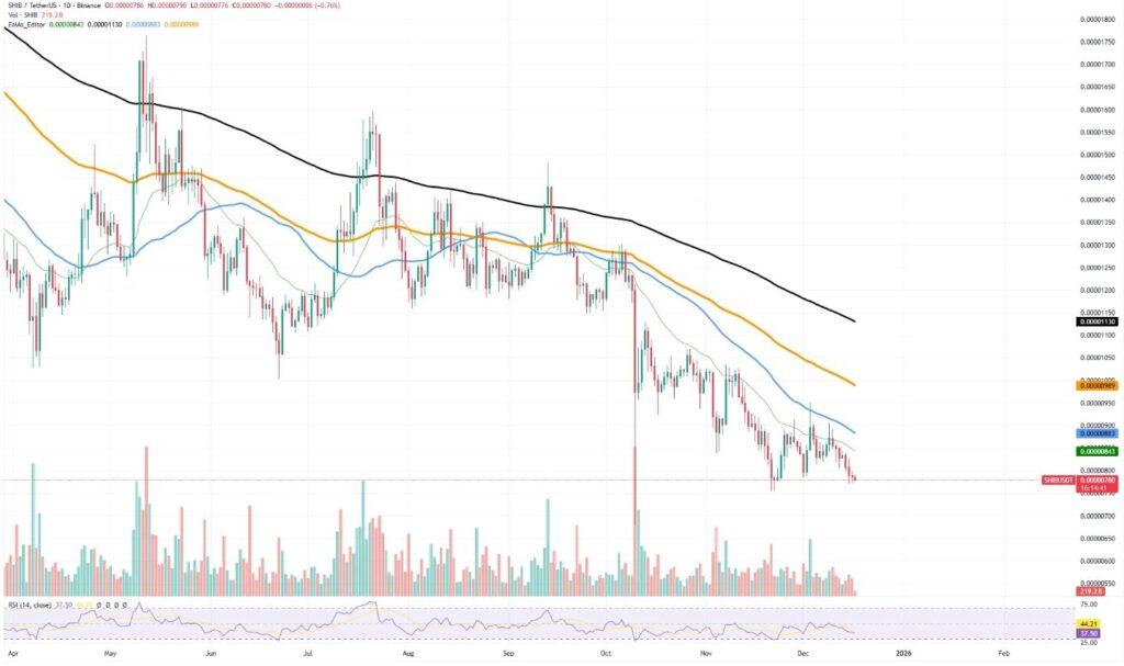 相对强弱指数 (RSI) 处于 40 左右的低位,表明动能疲软,但尚未达到极度超卖的程度。这种市场状况在几个关键交易动态方面呈现出疲软而非彻底崩盘的迹象。真正的底部形成过程通常会伴随剧烈的抛售或成交量的急剧飙升,但近几个交易日中,这两种情况均未出现,也没有任何明显的买盘压力。SHIB 技术分析显示,市场疲软但卖方尚未完全撤离,这加剧了人们对未来走势方向的不确定性,而这种不确定性又牵涉到多个关键价格因素。