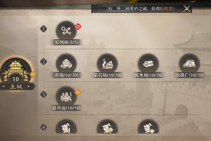 一般刚开始修建的都是主城区,随着资源的获取,可以建造兵营或者是其他的矿场,这时候矿场会获取大量的石料和铁矿,有了稳定的资源之后就能生成各类兵器,盔甲,初级状态下建造的城池防御力比较弱,如果有其他的成员进攻,很容易轻而易举的就被攻下,玩家需要多去消耗木材和铜钱,去升级这些城池的等级,这样就能抵御更多伤害,有了基础建筑之后,玩家就需要在科技树中做出相关的研究,这样能提升这些物资的获取速度。