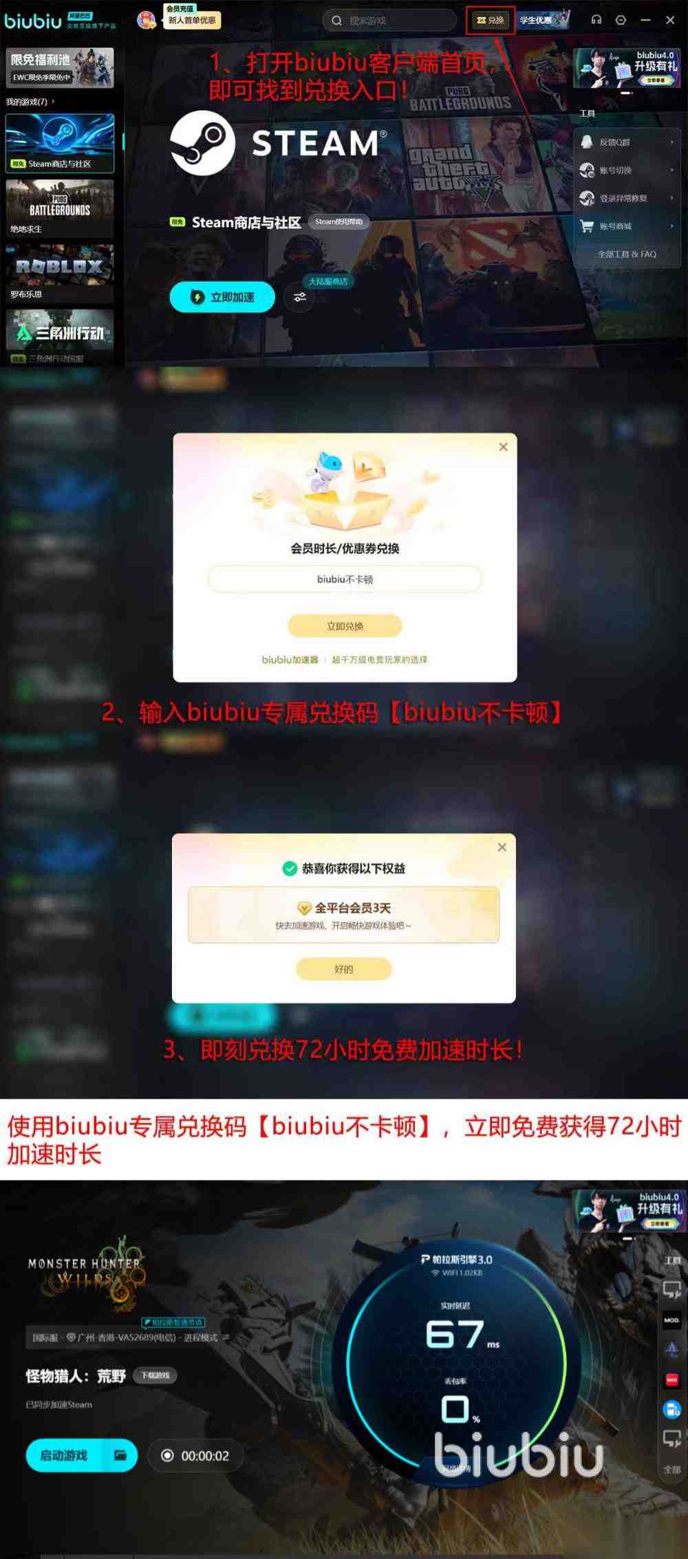 介绍的再好都不如自己去试试,因为有自信能让大家满意,所以biubiu加速器对新用户直接送出了24小时免费加速时长,注册登录就能领,完全没有多余套路和要求。如果觉得一天还不够玩,记得在兑换码界面输入【biubiu不卡顿】,则可以额外得到72小时的加速时长,这样算下来就是4天的免费体验时长呢,超给力!