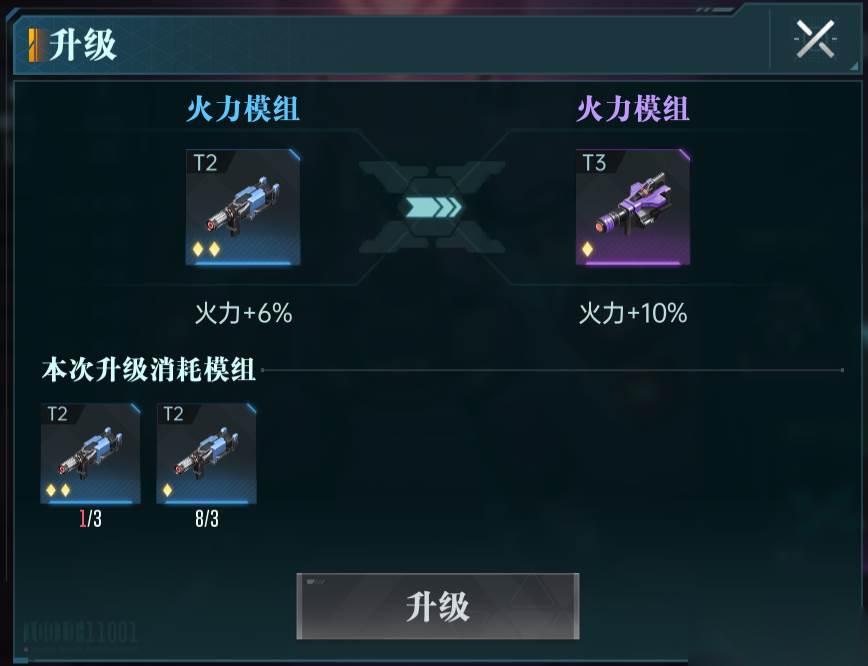 兵种模组可以进行升级,相同部位的3个一星模组可以合成二星模组,相同部位的4个二星模组可以合成更高阶的一星模组。穿戴5个部位的同阶模组之后,可以将对应兵种升阶。
