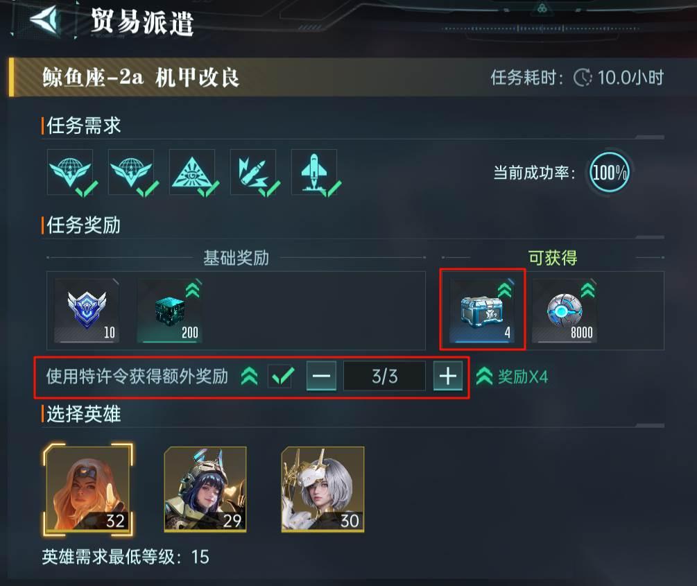 第二个就是星际贸易玩法。在星际贸易派遣中,任务成功率达到100%就必定可以获取到1个T2模组箱,再使用3张贸易特许令,单次派遣最多可以获得4个T2模组箱。算下来每天5次派遣,保底有20个T2模组箱可以拿。如果再遇到特殊派遣,每天最多可以拿到28个。
