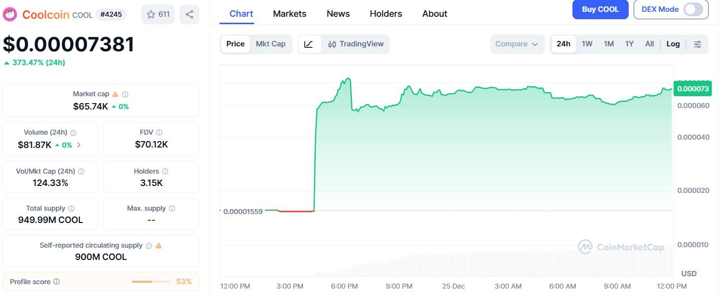 Coolcoin,又称Coolman Universe币,在圣诞节当天价格突然飙升,令加密货币市场大跌眼镜。短短24小时内,Coolcoin的价格涨幅高达373.47%,如图所示。CoinMarketCap官方图表数据.
