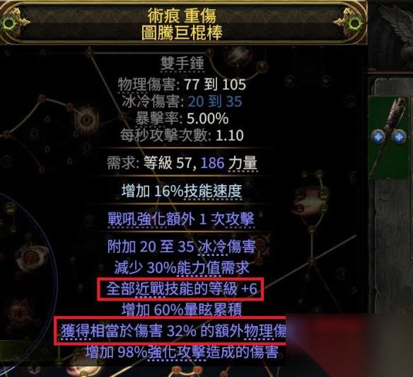 1、在前期力量不够高的时候我推荐使用单手锤,在外延词缀可以找到最多+5的技能等级,前缀我们使用精华去做额外物理伤害,再上一个深渊通货去解密被战吼强化的技能伤害,这样的武器就完全ok了。