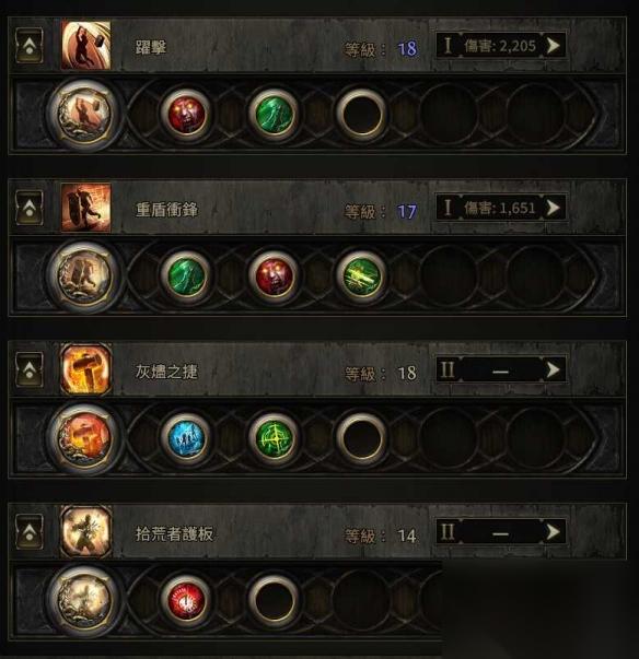 盾墙的辅助我们放疾速攻击2,沉重灰机,野性残暴,另外两个位置,攻坚的话,我们可以放近身战、分量、集中光环三选二,刷图的话,我们可以使用安的城塞和冈姆的疯狂,这两个辅助可以解锁盾墙的刷图牛逼形态,0.4这赛季当中安的城塞不再减少伤害了,属于是对我们这个bd的巨量提升。