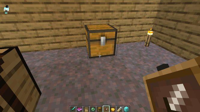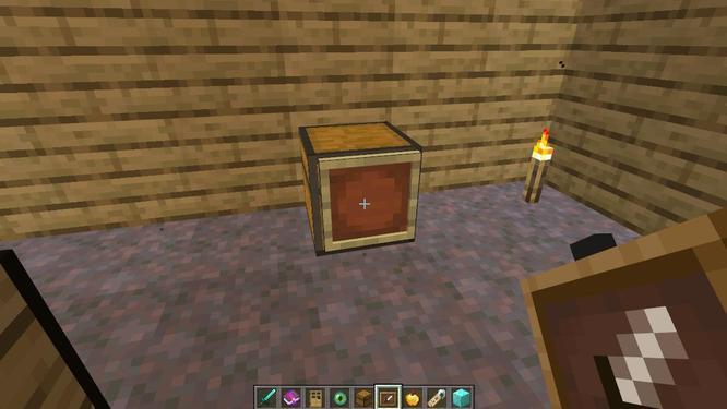 一、随机找个箱子,按SHIFT蹲下,手持物品展示框对着箱子点击鼠标右键,如下图所示;