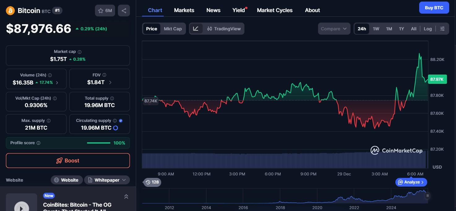比特币(BTC)价格股价为 87976.66 美元,在过去 24 小时内上涨 0.29%,交易量为 163.5 亿美元,市值为 1.75 万亿美元。