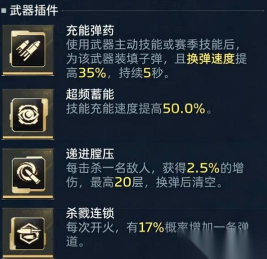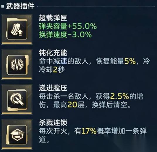 插件选择三槽递进压膛,可在击杀怪物时叠加+2.5% 增伤,最高可达50%增伤。