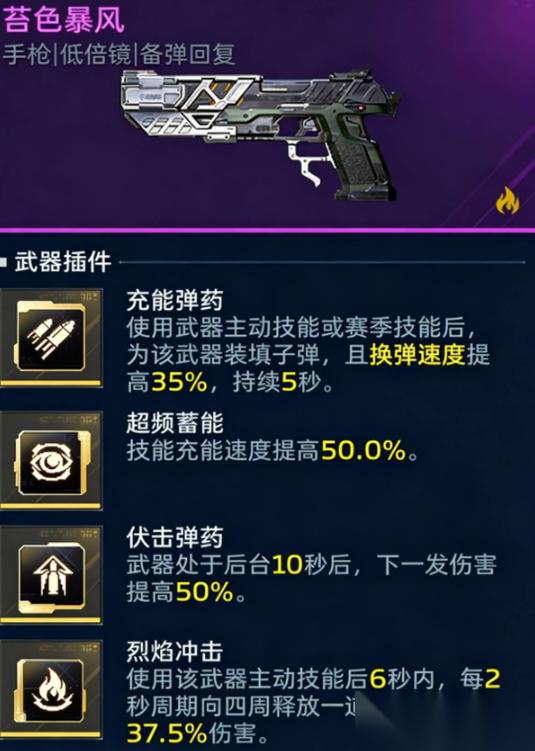 苔色暴风自带技能装弹,可持续为主武器提供弹药支持。