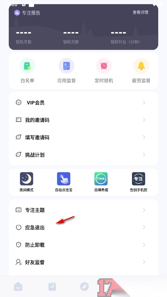 专注学习APP看名字就知道是一款用来专注学习的软件,非常适合一些没有自控能力的学生使用,只需要设置一个专注学习的时间,之后在该时间内将无法操作手机中的其他应用,以及无法接收到任何应用的通知打扰等,让孩子能够专注学习完成学习目标等,并且该应用中还支持添加监督人,让监督人监督自己早日完成学习目标,若是后期在锁机专注的过程中,想要强制退出专注页面,可以选择让监督人给自己解锁,只需要填写需要解锁的好友邀请码信息即可快速的解锁操作,打开应急退出窗口即可设置。