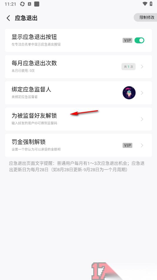 在很多用户的手机上会安装专注学习APP这款软件来学习,大家在操作这款软件的过程中会添加监督人,防止有些时候在专注期间想要退出锁机模式,那么就需要通过监督人帮忙解锁操作,当然用户也可以设置一个应急退出的次数,在每个月可以获取到相关的解锁次数,然后强制退出专注页面等。