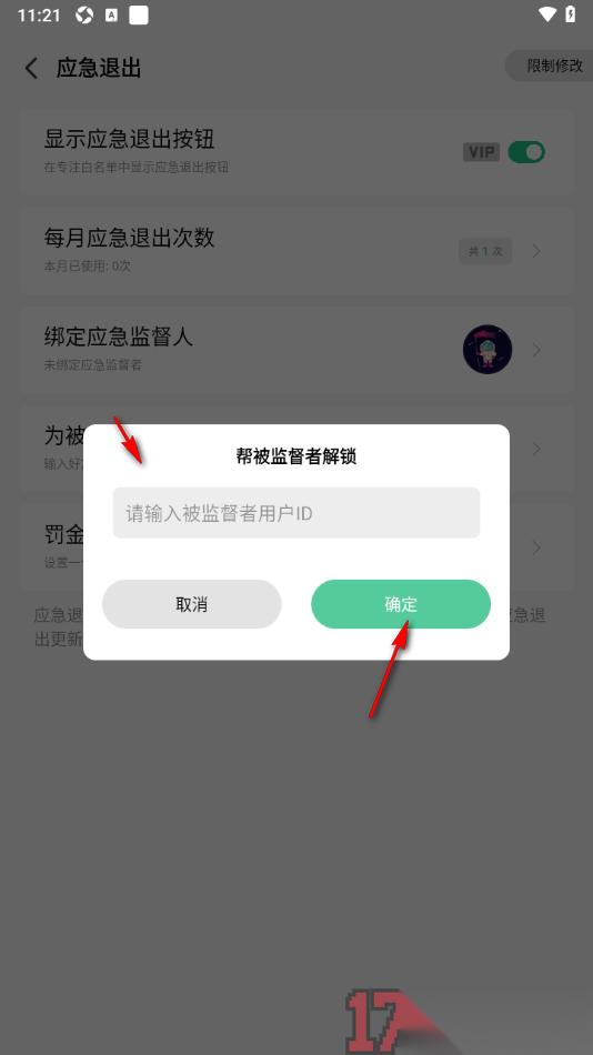 4.在该窗口中输入被监督者的用户id号,之后点击确定按钮即可快速的解锁操作,那么好友即可退出专注。