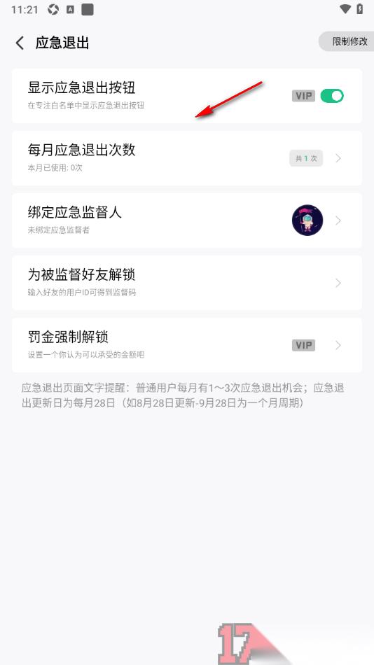 5.除此之外用户还可以设置每月应急退出次数、显示应急退出按钮、绑定应急监督等相关内容,如图所示。