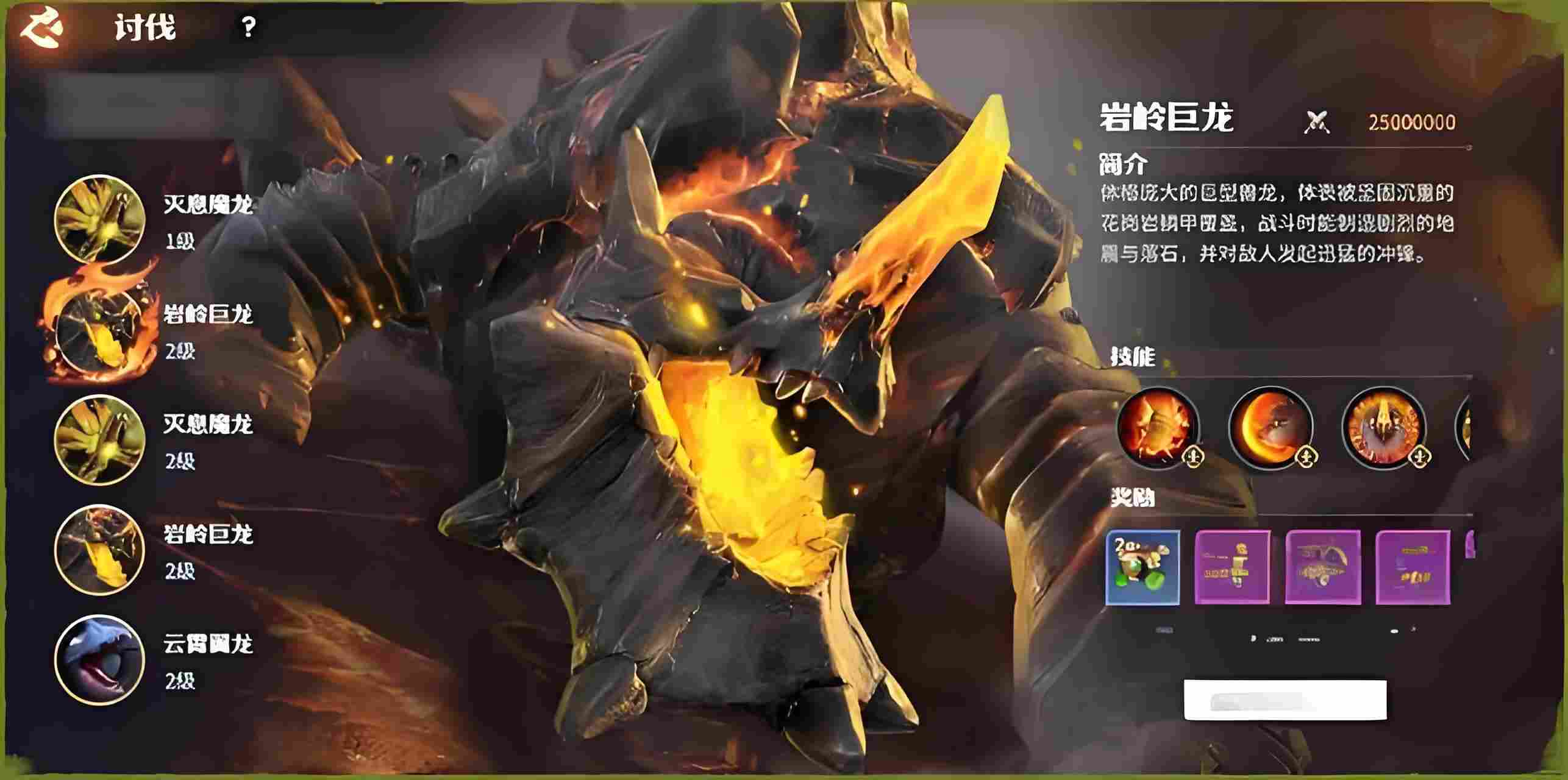 3、岩岭龙这货力气贼大,三个主动技能一个比一个狠。崩山裂地会砸地板,碎岩角站带眩晕,掠食冲锋跑得飞快。被动技能更恶心,血越少攻越高,残血时候得小心别被它反杀。打它得带够奶妈,慢慢磨最稳妥。