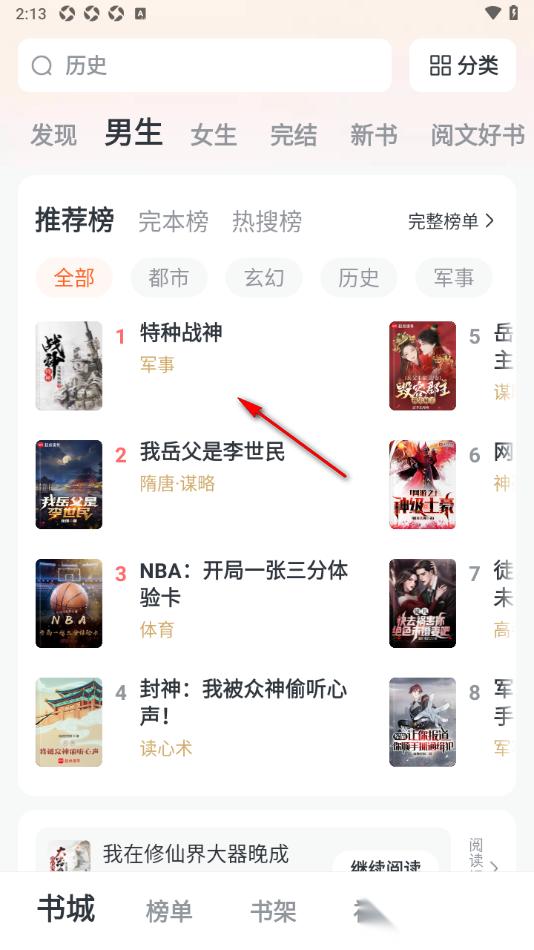 1.来到当前打开的全免小说APP操作界面中,选择自己感兴趣的小说,将其点击打开即可。