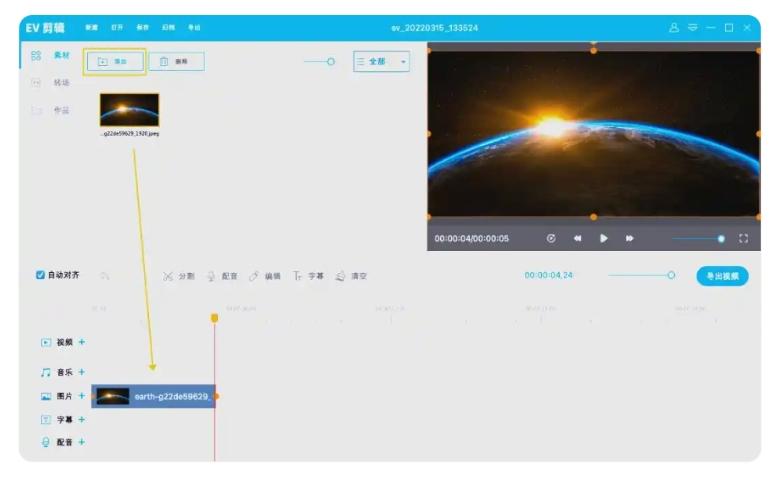 3、接着,点击“添加”选项来导入所需的背景图片,并使用鼠标将这张背景图片拖动到下方的编辑轨道中。