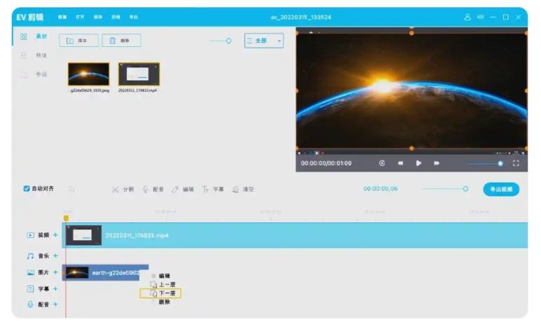 5、接下来,点击“添加”按钮来导入视频,并将其拖拽至下方的编辑轨道上。然后,在预览框中,对背景图片点击右键并选择“下一层”,以便将图片置于底层。最后,根据需要调整视频的大小和位置。