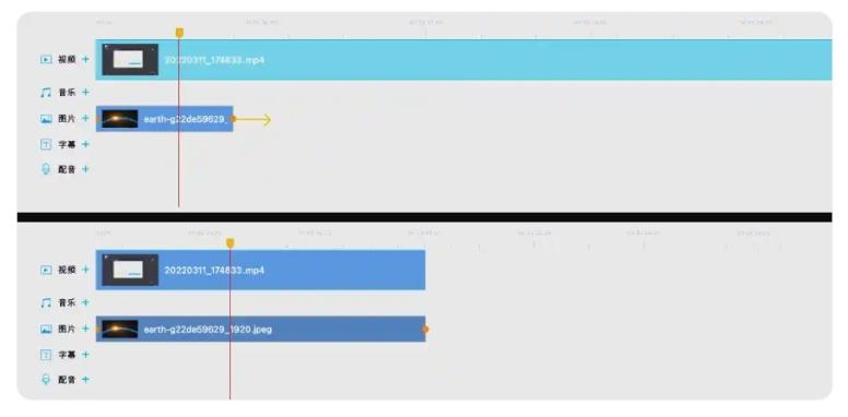 6、可以在轨道上将背景图片的时长设置为与视频一致,以确保图片与视频的完美同步。