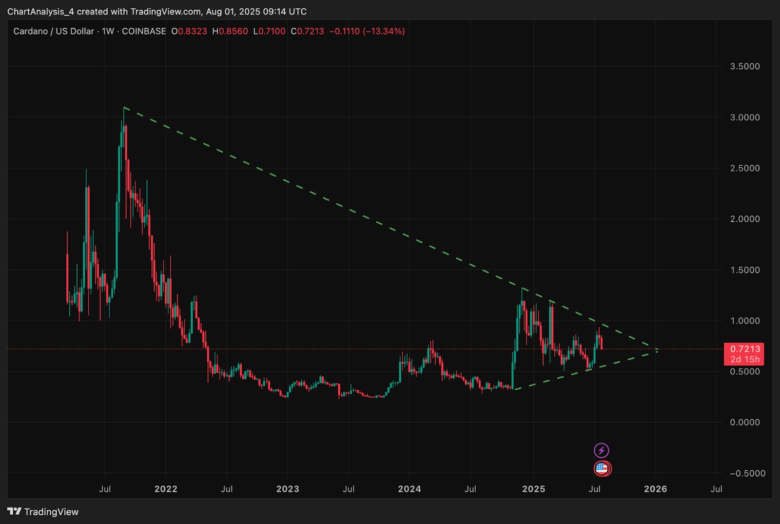 周线图显示,ADA 正逼近多年对称三角形的收敛点。价格未能突破 2021 年历史高点以来的下行阻力位,目前正接近 0.68 美元附近的三角形支撑趋势线。宏观格局已接近终结,突破方向可能为第三季度剩余时间的走势定下基调。