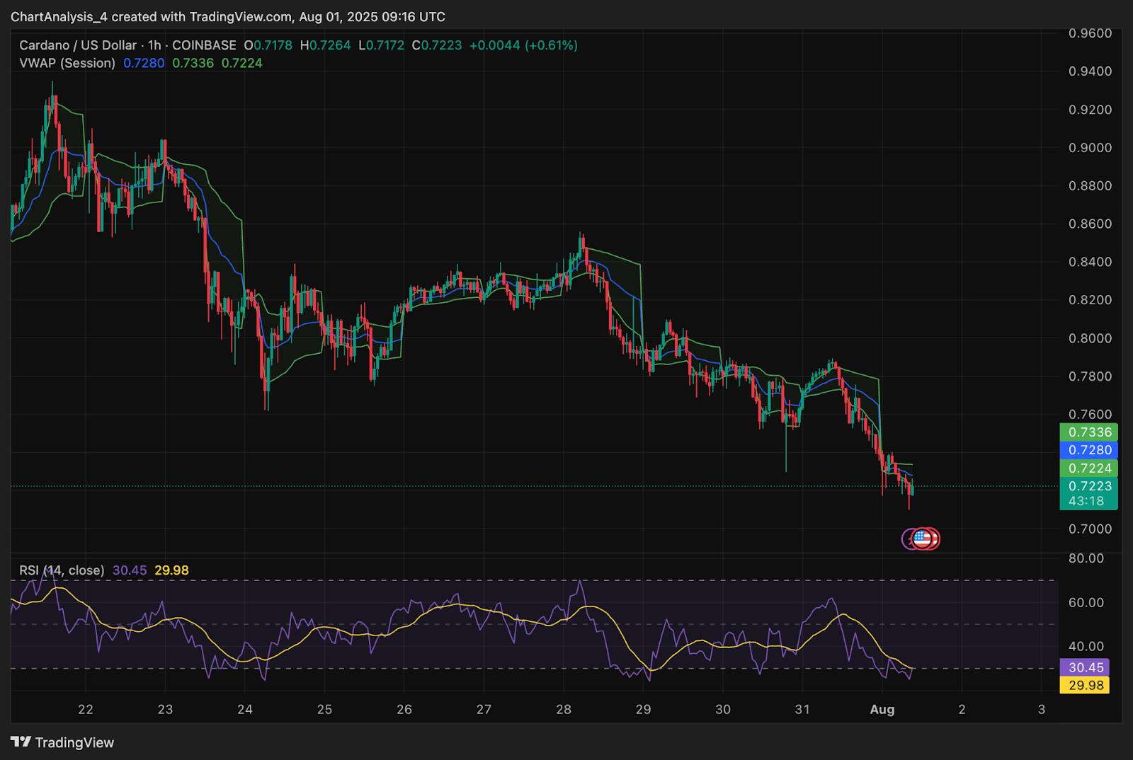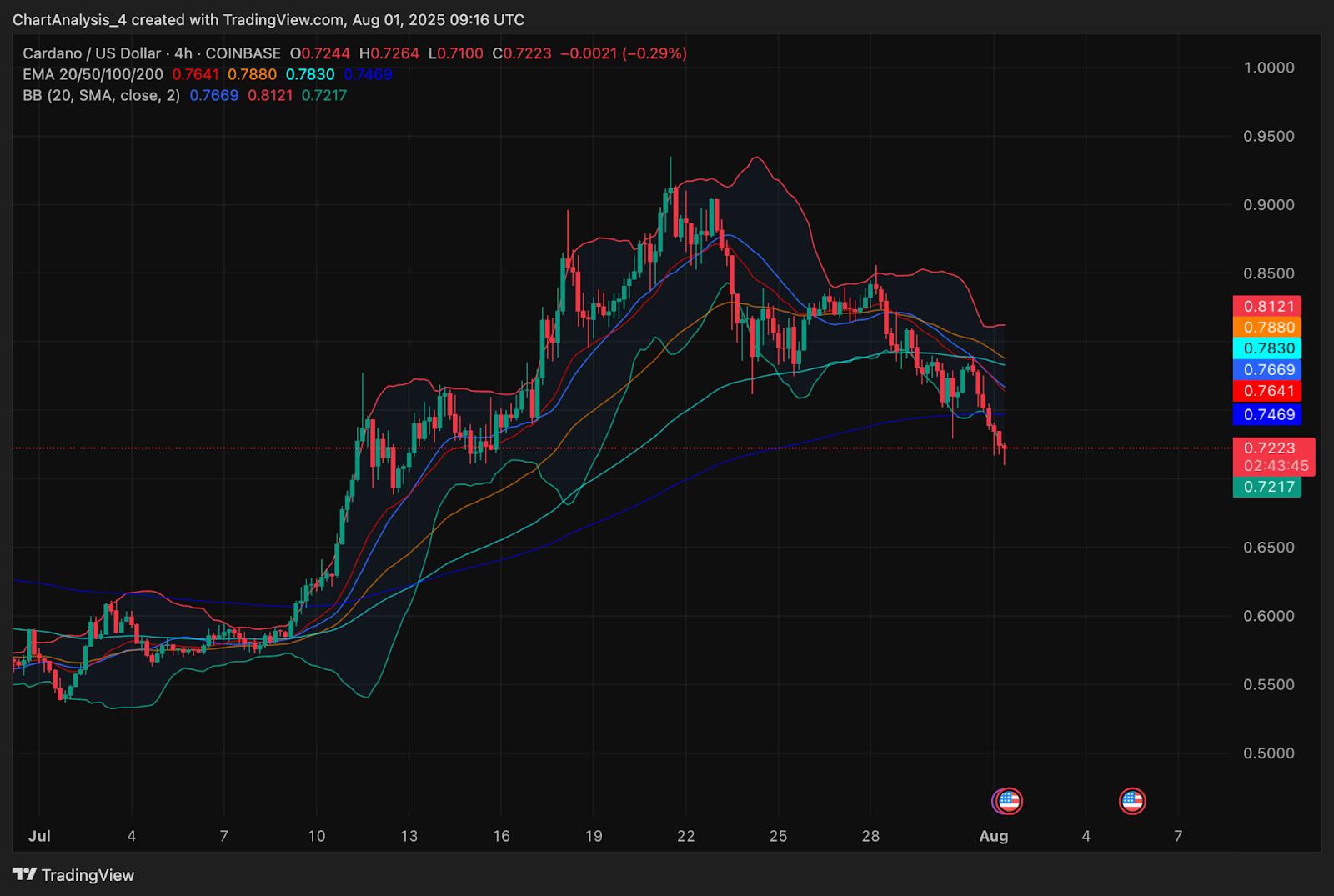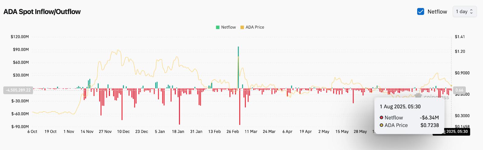 卡尔达诺价格今日下跌的原因,既在于链上压力,也在于技术结构弱化。8月1日的现货数据显示,净流出金额为634万美元,表明持续的抛售兴趣和交易所驱动的退出。