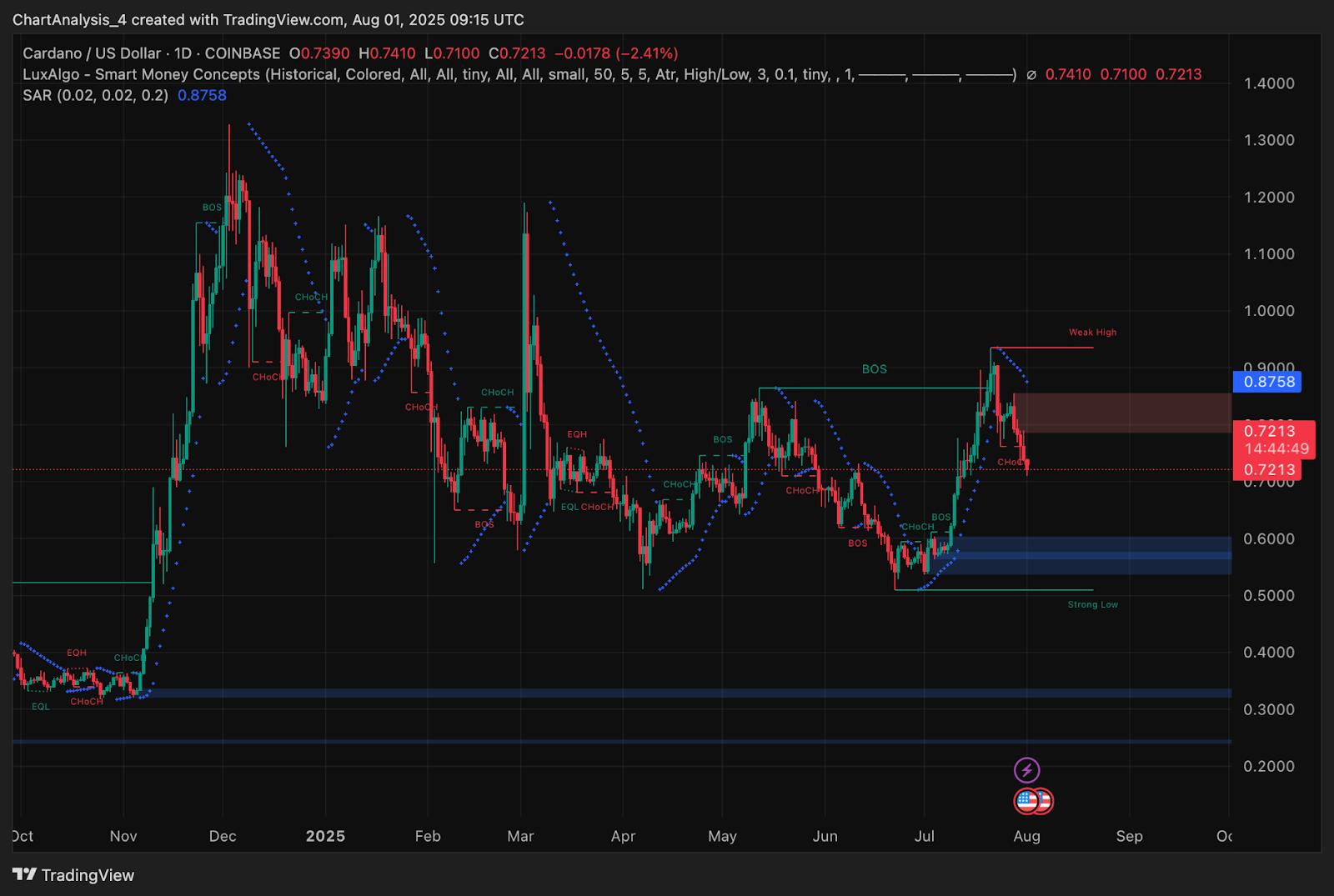 日线图上,卡尔达诺价格走势在跌破7月0.87美元附近的反弹高点后,呈现出明显的“特征变化”(CHoCH)。价格已进入红色供应区,抛物线转向指标点仍位于价格上方,表明空头继续控制着动能。