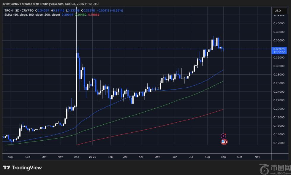 TRON (TRX) 尽管近期波动较大,但仍保持强劲上涨趋势,并维持在 0.33 美元上方。图表显示,TRX 自 2025 年初以来一直保持看涨势头,受持续走高的低点和强劲的买盘兴趣支撑。在触及 0.36 美元附近的峰值后,价格进入短期盘整阶段,多头正努力捍卫 50 日移动平均线 0.29 美元附近的关键支撑位。