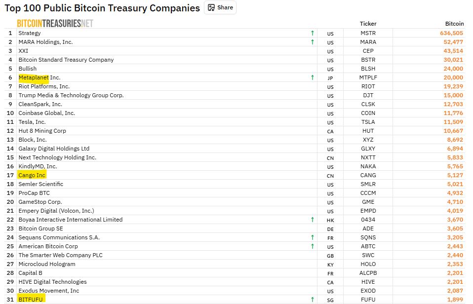 顶级公共比特币财务公司(: BitcoinTreasuries.NET )