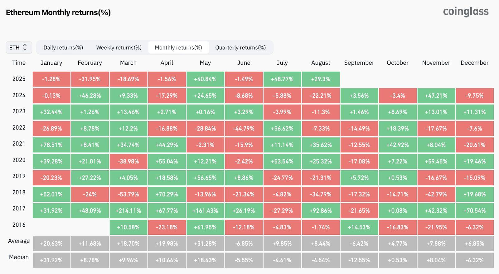 据CoinGlass数据,自 2016 年以来,以太币仅有三次在 8 月份上涨,而每次上涨之后都在 9 月份下跌。