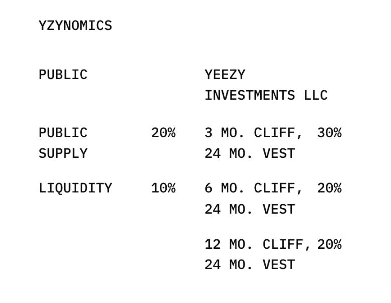Yeezy Investments LLC 实体公司将获得 70% 的代币供应,会采用分阶段释放机制,以防止早期抛售。具体如下: