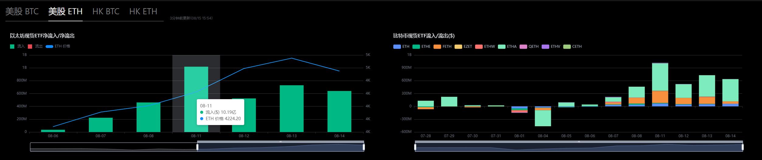 回顾8月11日至14日的资金流向数据,ETH现货ETF的表现堪称“加冕时刻”。四天内,ETH现货ETF的日均净流入量高达7.28亿美元,同期BTC现货ETF的日均流入量为1.4亿美元,前者是后者的5倍以上。