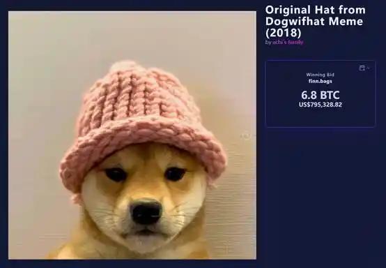80 万美元的溢价,是 meme 的「原味」价值。@finnbags 拍下的这顶,是 Solana 上著名的 meme 币 $WIF(dogwifhat) 在 2018 年的原型 meme 中所出现的那顶。现在,这顶帽子将永远从上图这只可爱小狗的头上离开,到 Bags 的手中。
